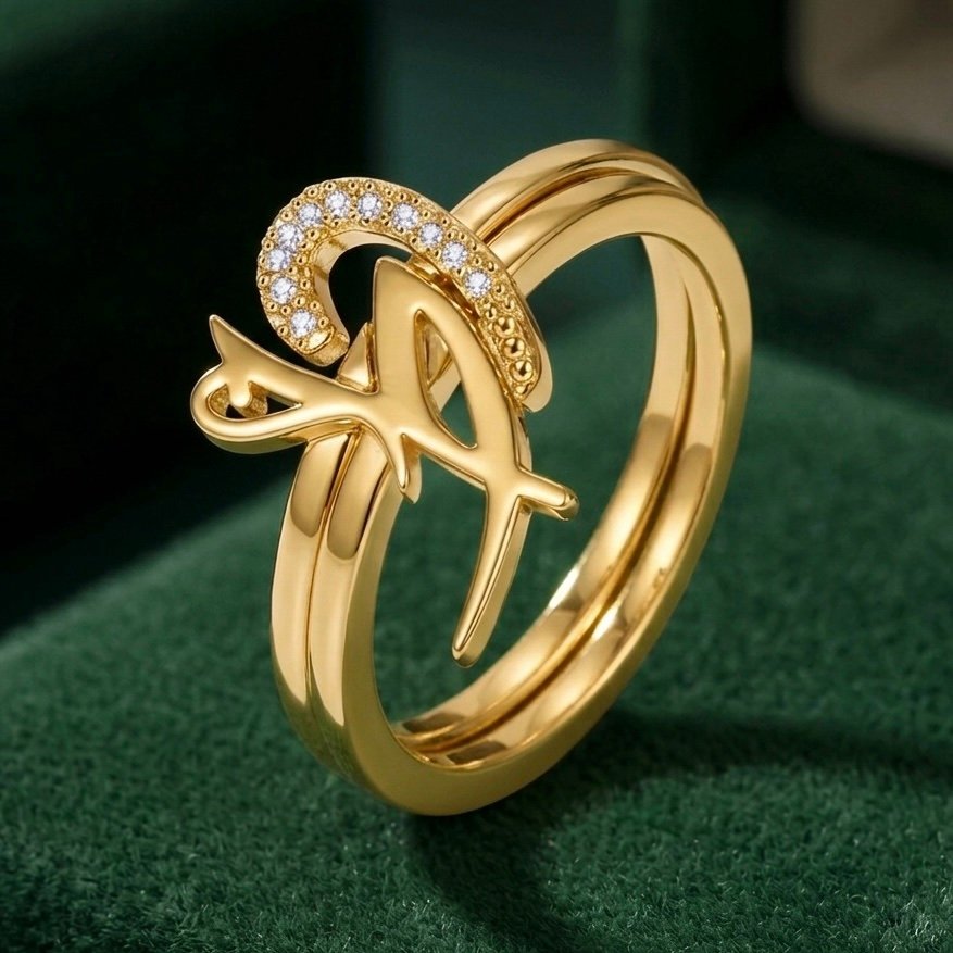 أضف لمسة من الفخامة على إطلالتك مع خاتم الأحرف المتشابكة الفاخر، بتصميم أنيق يرمز إلى الترابط والحب.