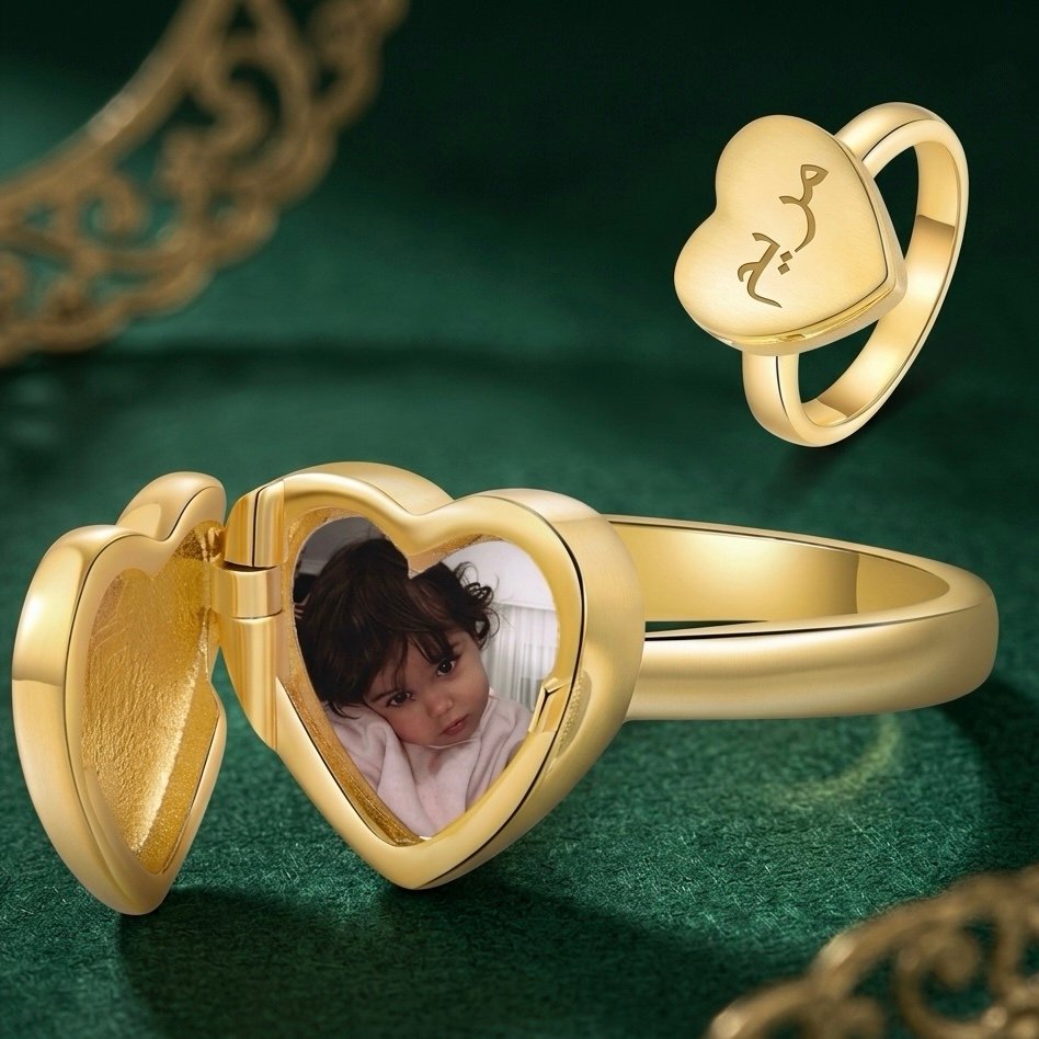 خاتم صور شخصية على شكل قلب، قطعة واحدة، خاتم تذكاري مع صورة مخصصة، ونحت اسم من خارج الخاتم